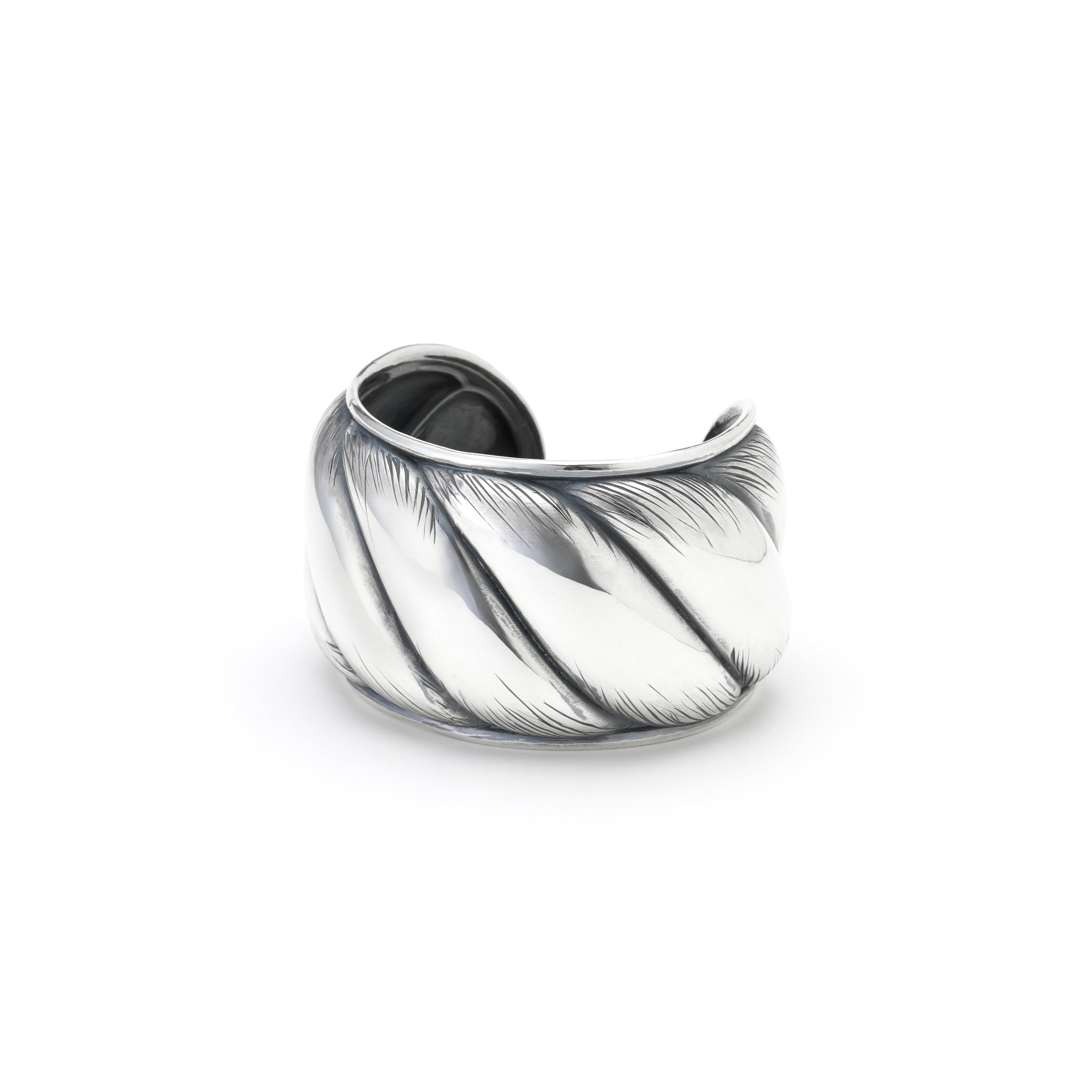 コレクションNo.9。No.9からリリースする新たなメインモチーフ“縄目” 強く主張するモチーフを大胆な大きさのバングルで表現し、ハンドクラフトによるテクスチャーといぶしの仕上げが印象を引き締めている。 手間を惜しまず鏡面の仕上げを施してから手作業で地肌の表現を施し、さらにそこから丁寧に磨きをかけて表情を完成させる。 一点一点の僅かに異なる表情の違いがクラフト感を強調している。