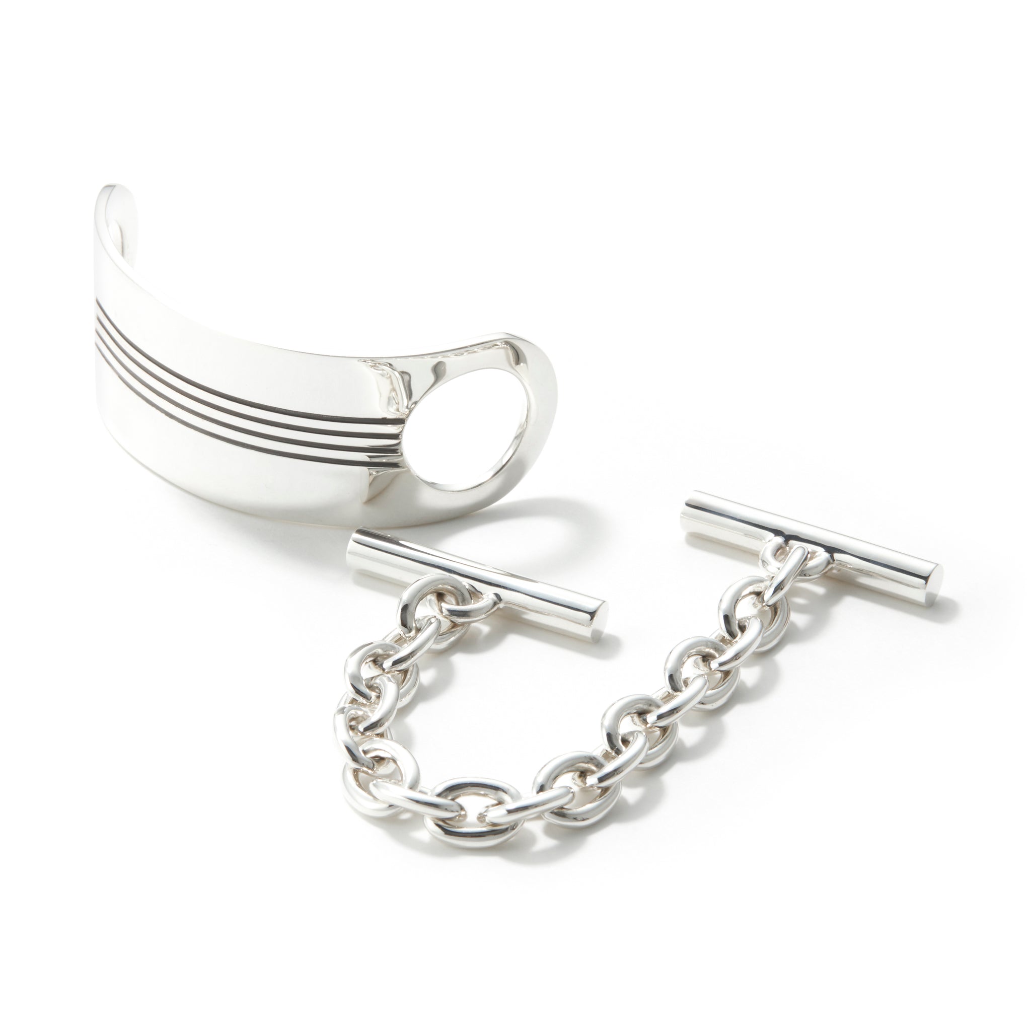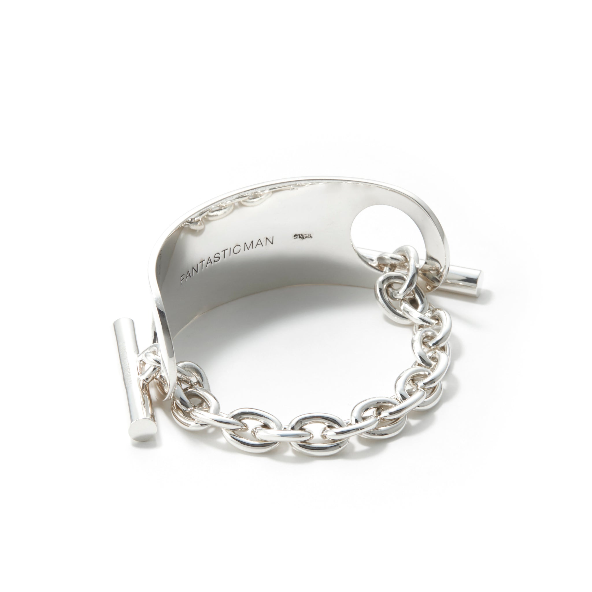 コレクションNo.8。ラウンドしたプレートデザインと、近年主流のTバーチェーンが融合するブレスレット その日の気分でプレート側とチェーン側と2通りの着用が楽しめるアイテムです。