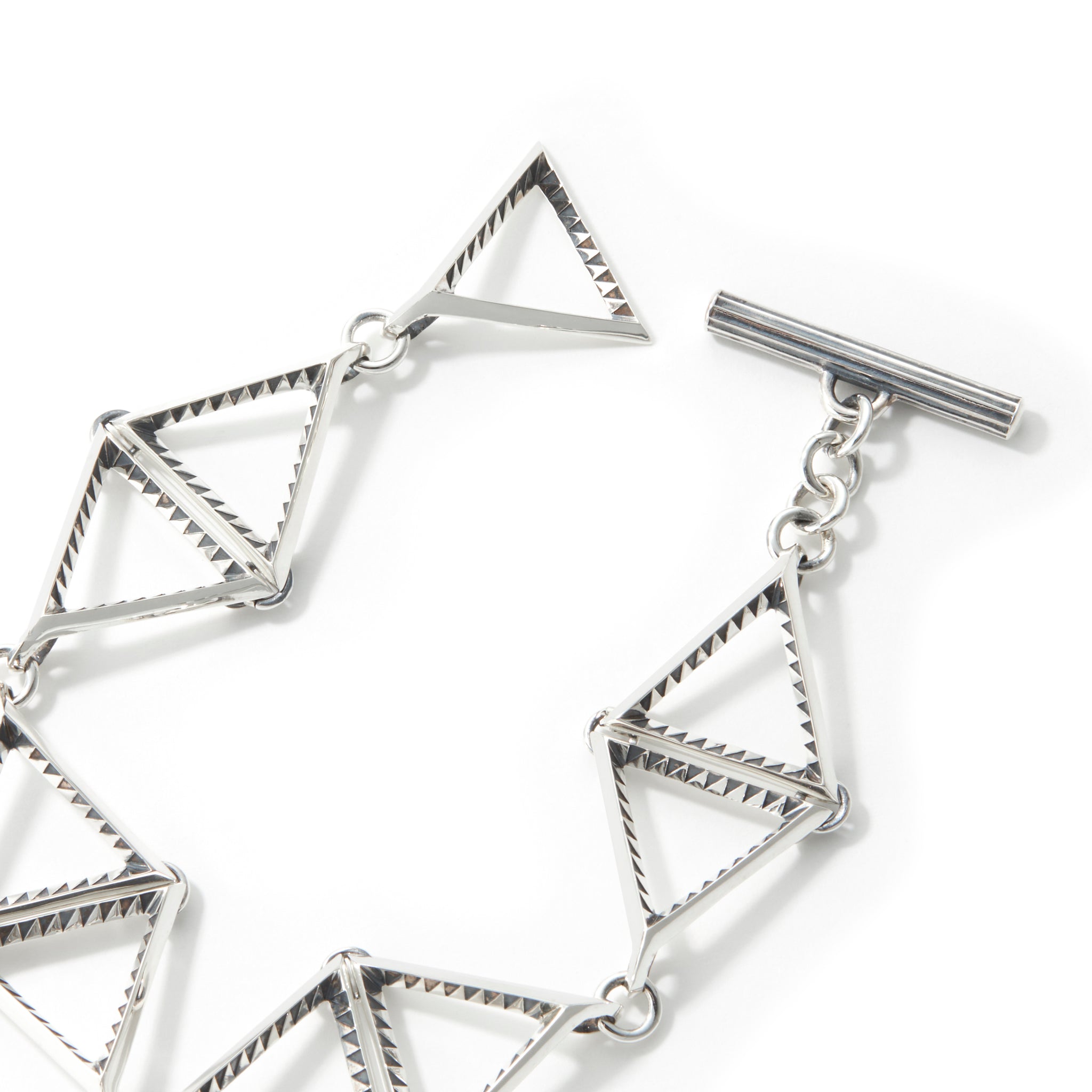 コレクションNo.9。902/903と同じく、トライアングルをベースとしたメインモチーフを惜しげなくブレスレットとして組み上げ、ブレスレットでは定番となるTバーはボリューム感を抑えて全体のバランスを整えたことにより、FANTASTIC MANらしい主張の強いアイテムながらエレガントにすっきりとした印象を与えている。