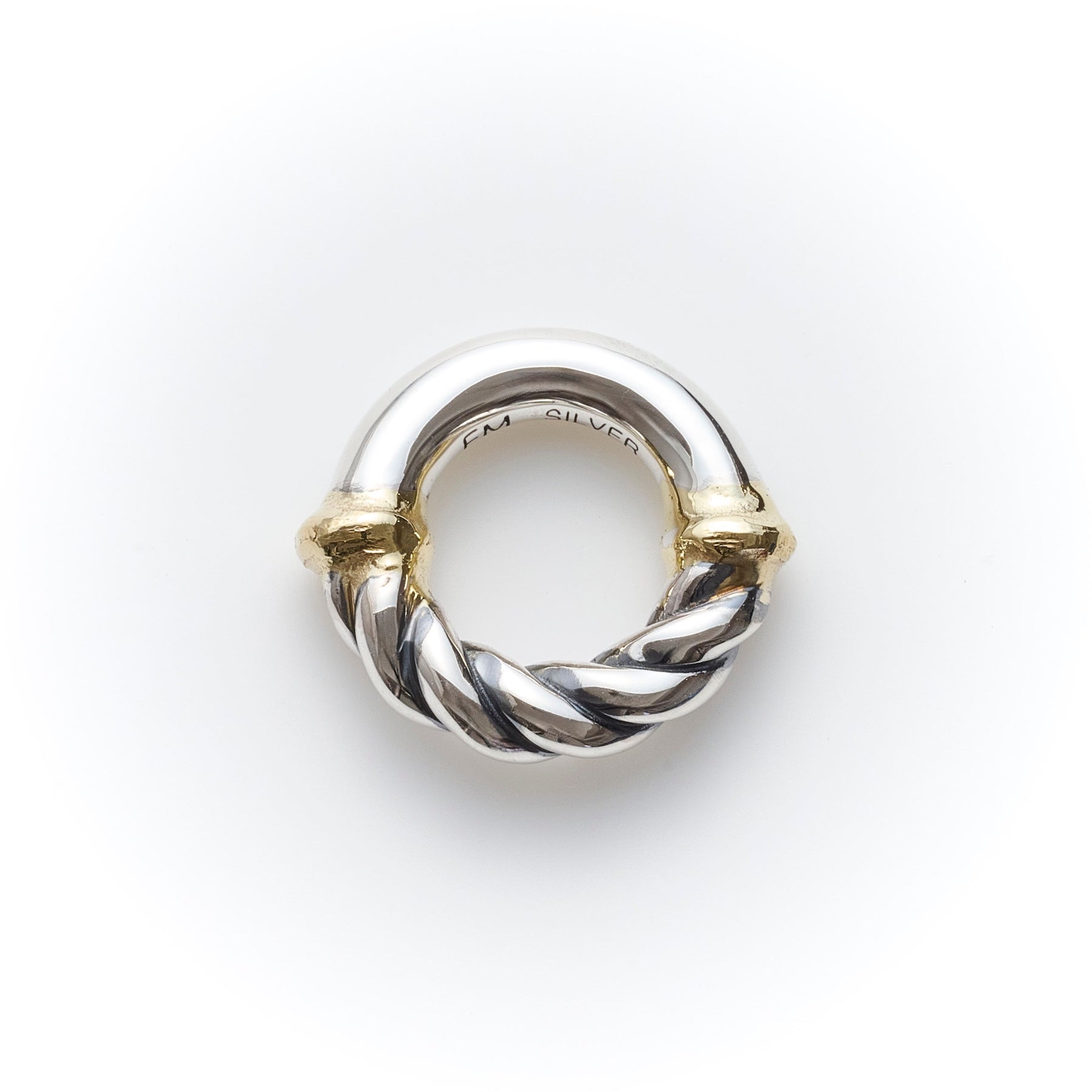 スターリングシルバーライン/ ONE GOLDシリーズ/ 金ロウアクセントモデルワンポイントにあしらった金ロウを界に異なるテクスチャで切り替えたサークルデザインのネックレストップ。クラフト感のある仕上げを残す2箇所のゴールドアクセントが首元で引き立つやや小ぶりのサイズは2連3連での重ね装用でも上品さを損なわない仕立てとしたアイテムです。品番の異なる3種のデザインもご用意し、同シリーズの小さなサイズのリングとの重ねや、ブレスレット、バングル、イヤリングとそれぞれのコーディネートでご自身だけの組み合わせと魅せ方をお楽しみいただけます。