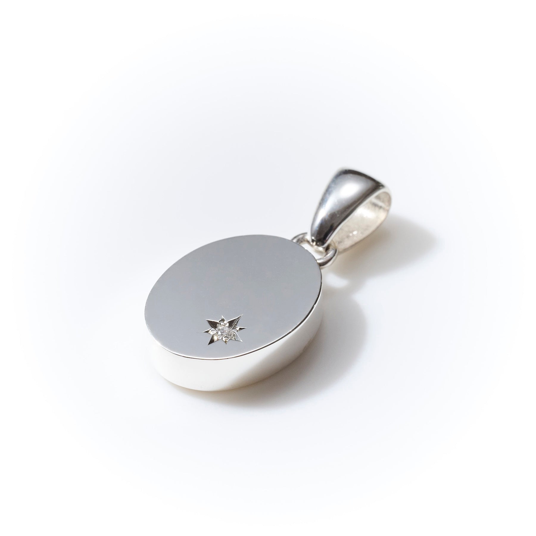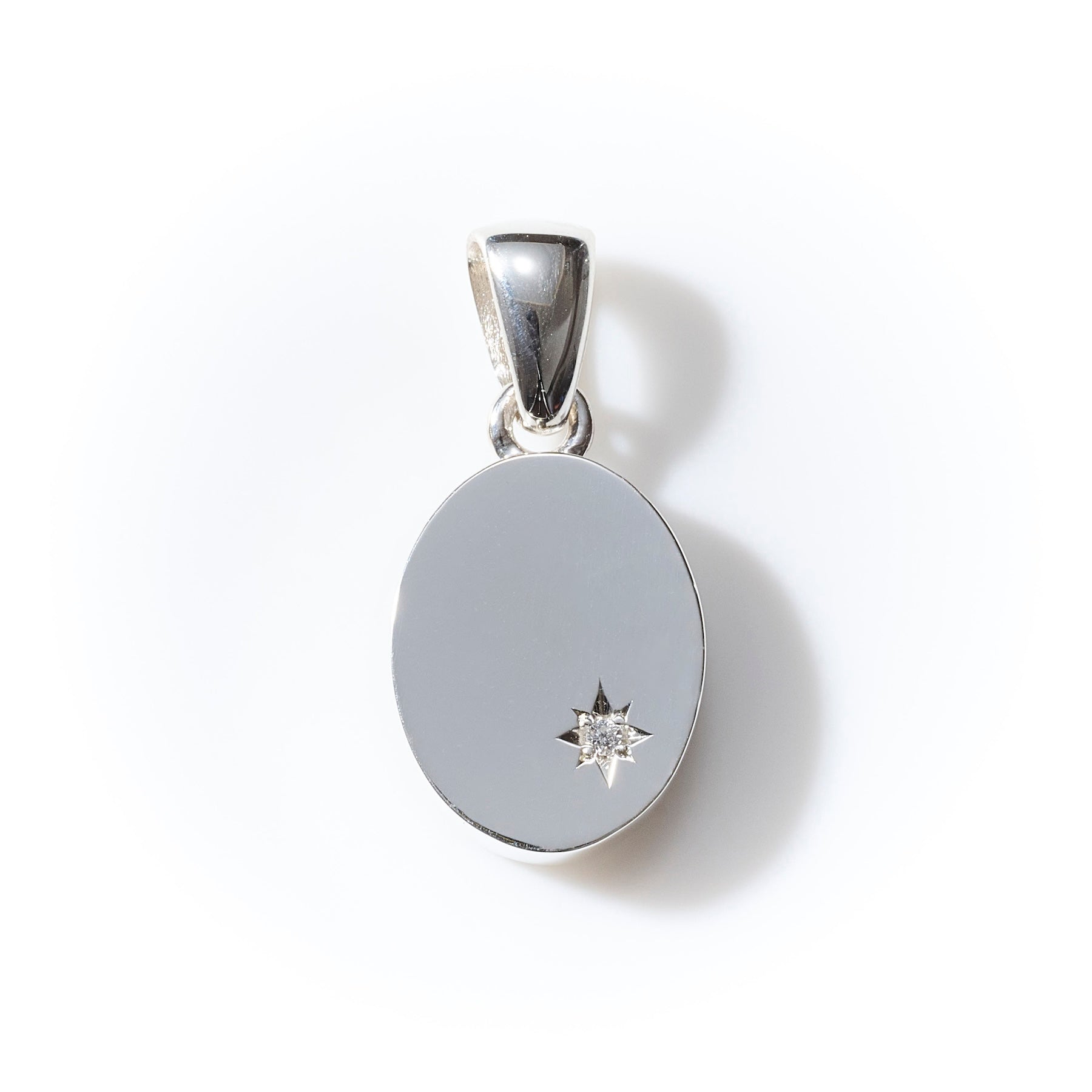 ほどよく存在感のある大きさのサークル面造形とハンドクラフト彫刻によるワンポイントのダイヤモンドが相まって嫌味のない上品さを醸すネックレストップ。