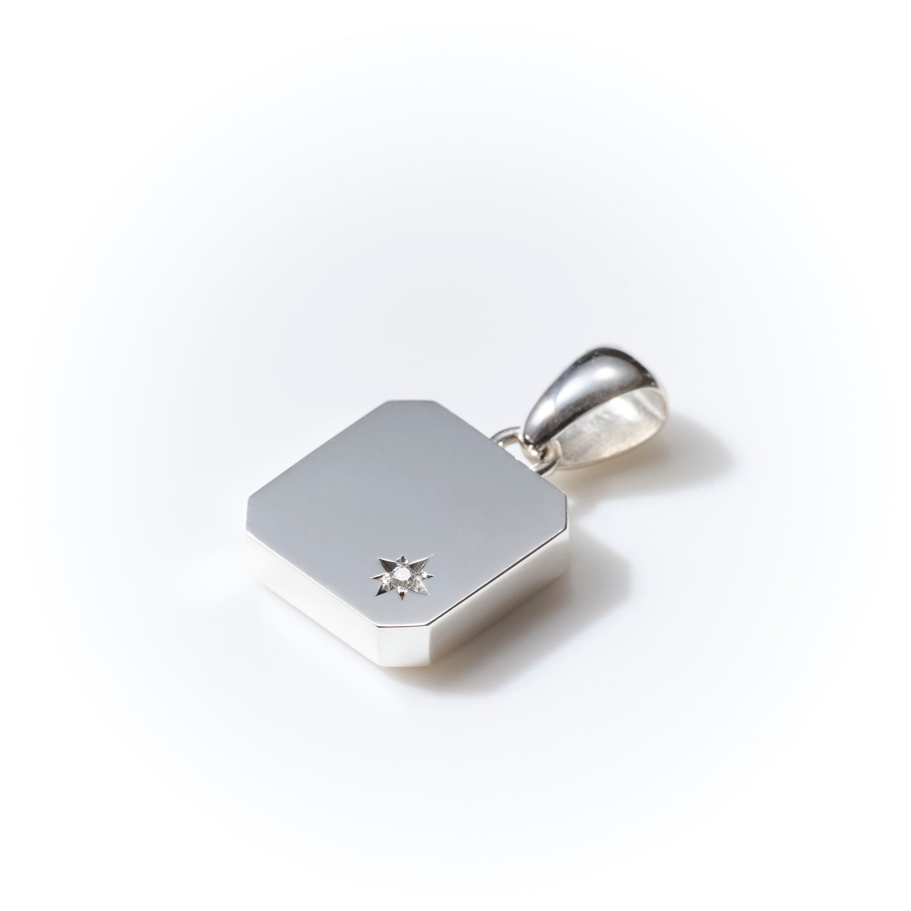 ほどよく存在感のある大きさでスクエアな面造形とハンドクラフト彫刻によるワンポイントのダイヤモンドが相まって嫌味のない上品さを醸すネックレストップ。