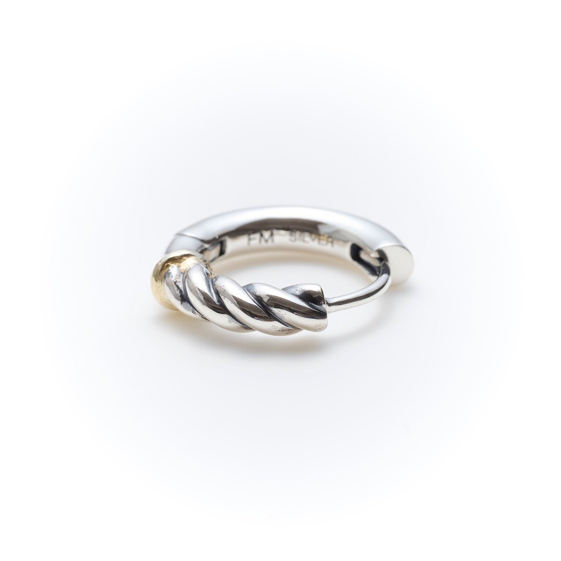 ワンポイントにあしらった金ロウを界に異なるテクスチャで切り替えたフープ型デザインのキャッチレスイヤリング。